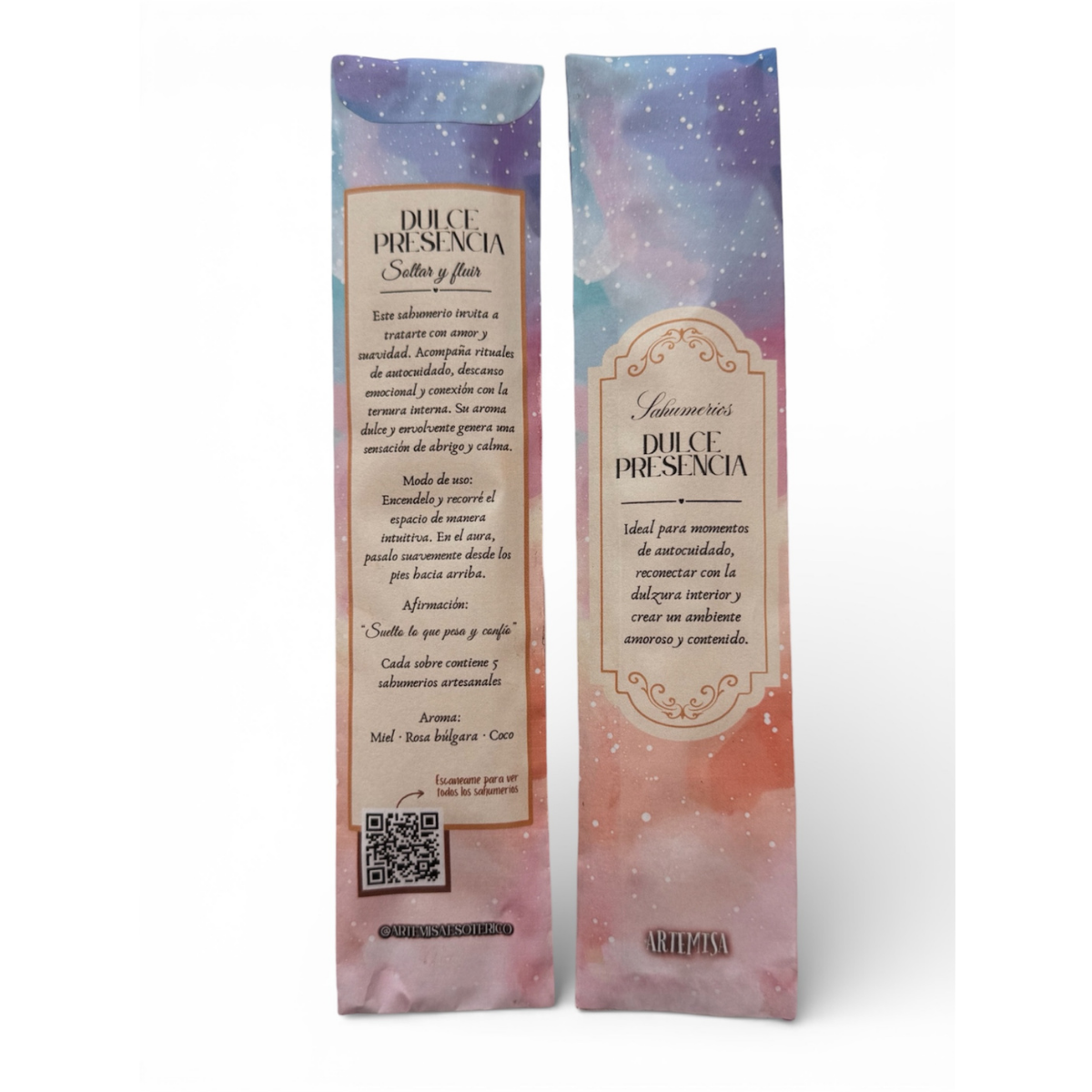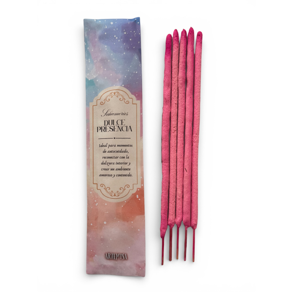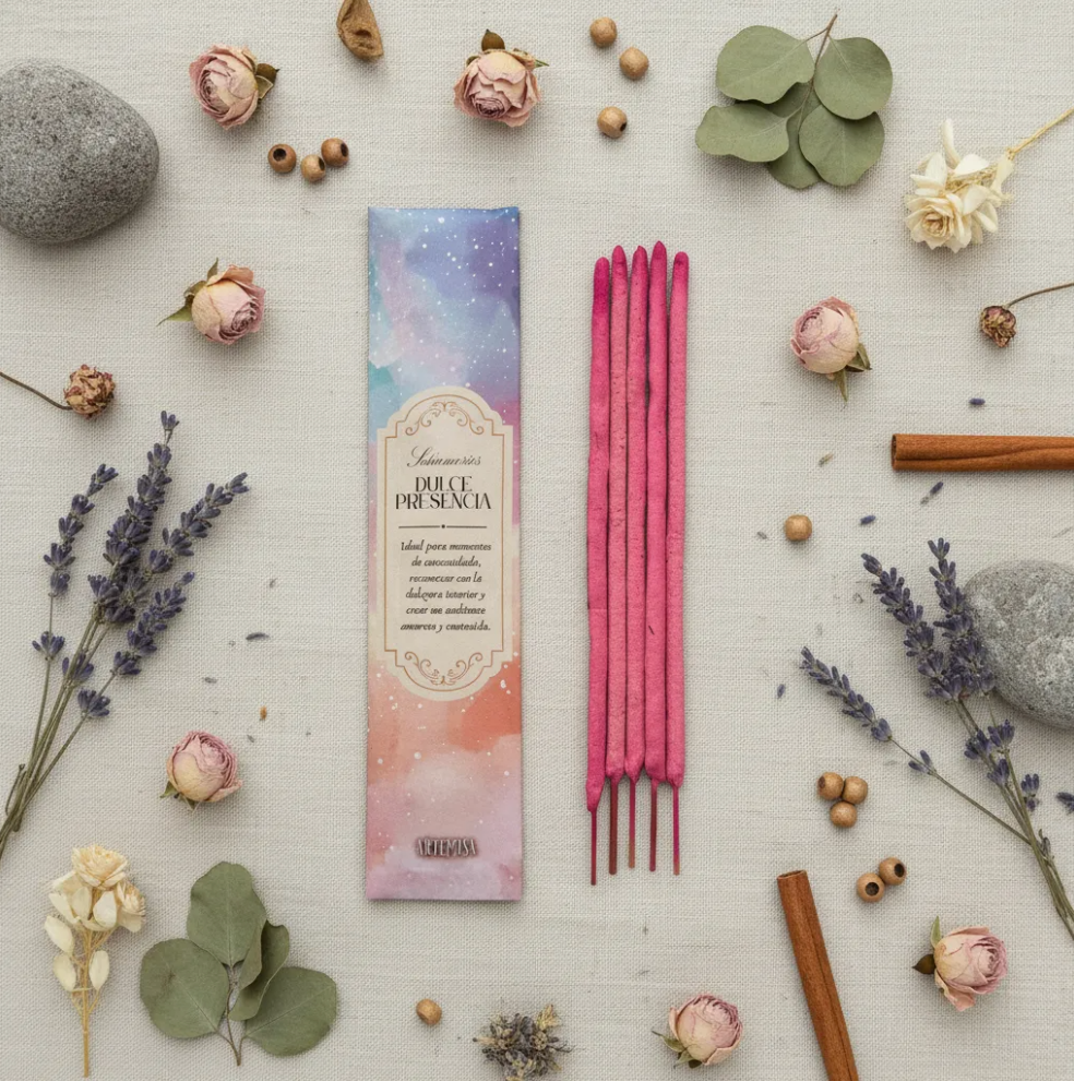 Dulce Presencia es un sahumerio artesanal creado para envolver el ambiente en una energía de amor, ternura y suavidad. Ideal para momentos de autocuidado, mimo personal y conexión con lo afectivo.